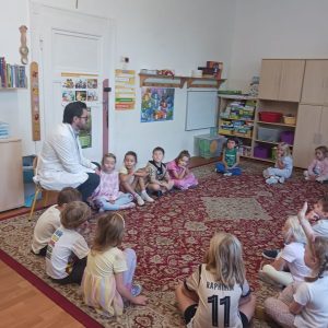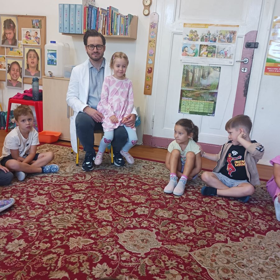 10 września 2025 Gajowickie Skrzaty z grupy V gościły Tatę Zuzi, który z zawodu jest lekarzem neurochirurgiem. Pan Doktor zapoznał dzieci z zawodem lekarza oraz odpowiedział na wszystkie zadane pytania.
