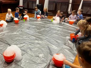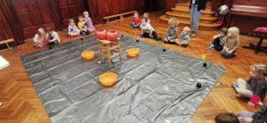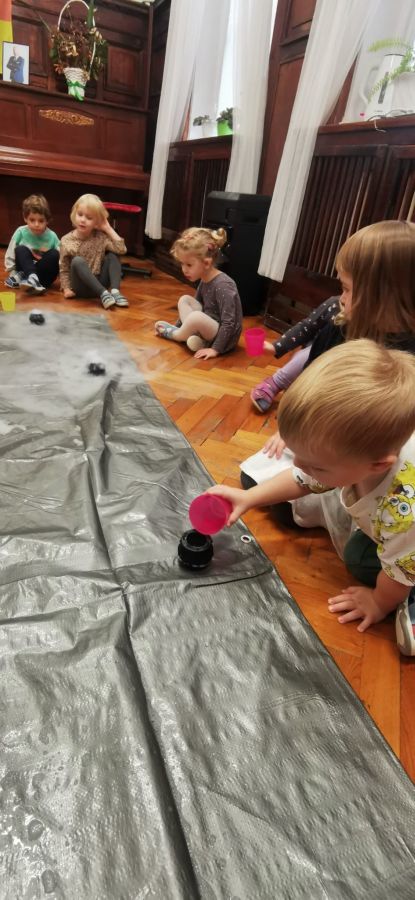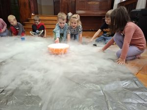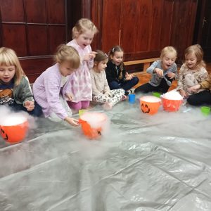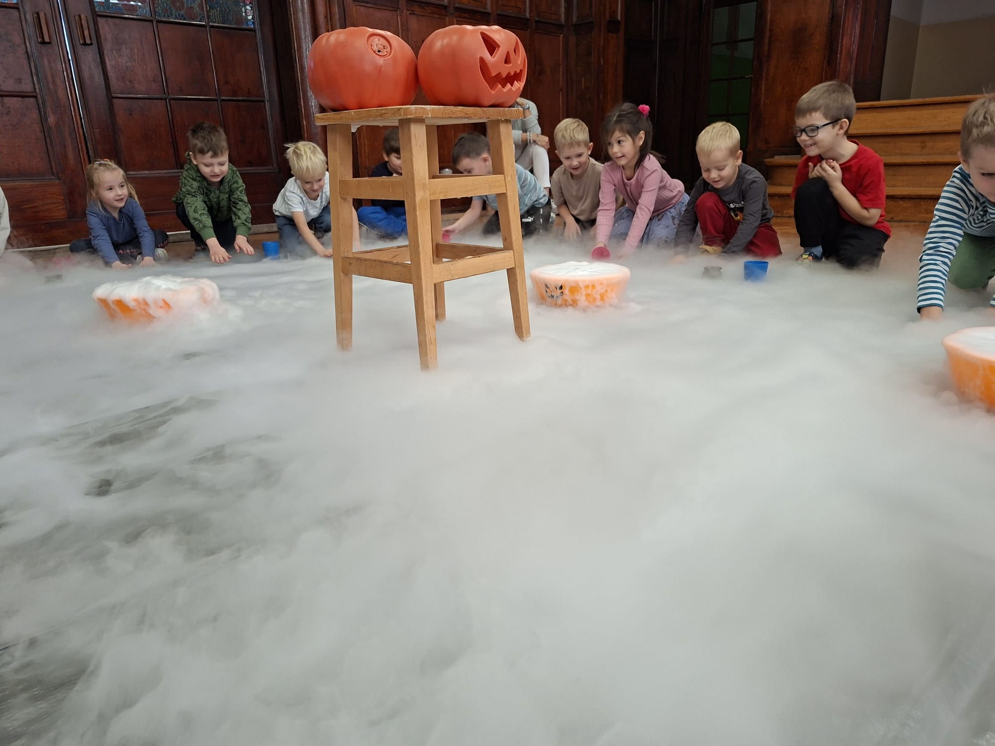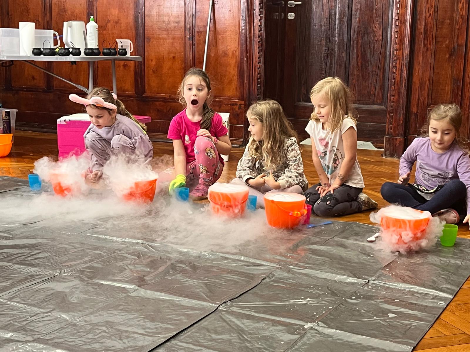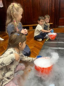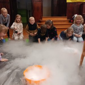 23 października przedszkolaki uczestniczyły w pokazie spektakularnych eksperymentów chłodzących, podczas których mogły zobaczyć na własne oczy niesamowite efekty wizualne. Dowiedziały się, czym jest suchy lód, jak powstaje oraz dlaczego paruje, nie zamieniając się w wodę.