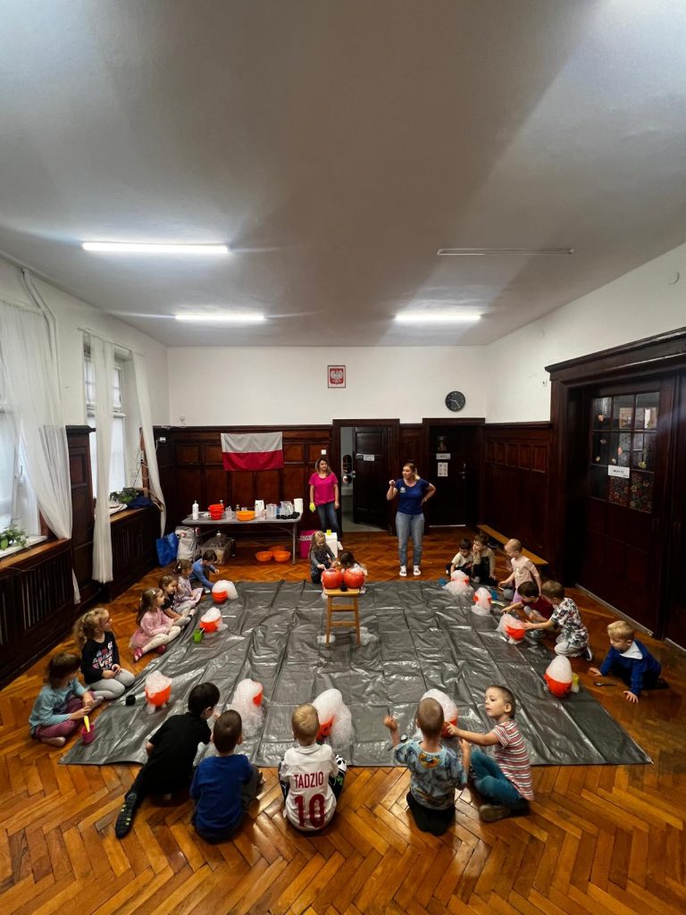 Dzieci nie tylko obserwowały doświadczenia, ale również aktywnie w nich uczestniczyły – tworzyły wybuchowe dynie i budowały maszynę do baniek!