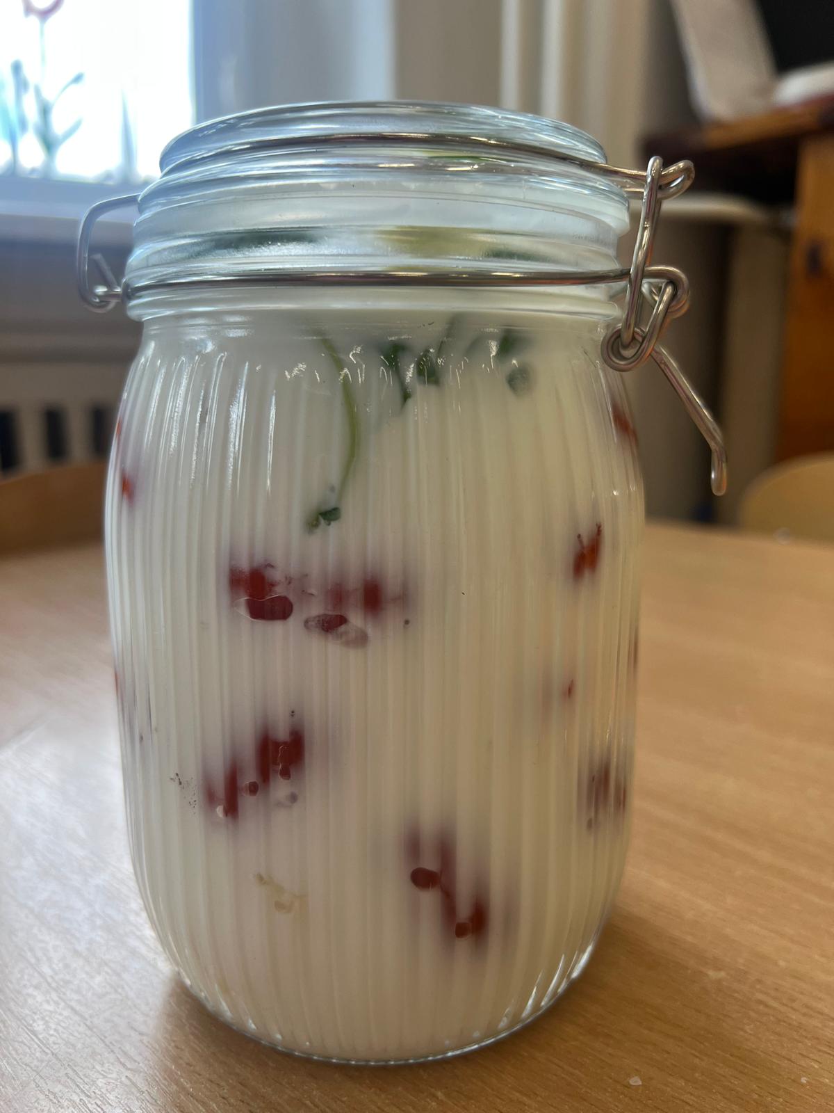 Do słoików, oprócz pomidorów, powędrowały aromatyczne dodatki: czosnek, cebula, imbir oraz świeża bazylia. Zapowiada się prawdziwa poezja smaku – a wkrótce także pyszny chłodnik z kiszonych pomidorów!